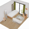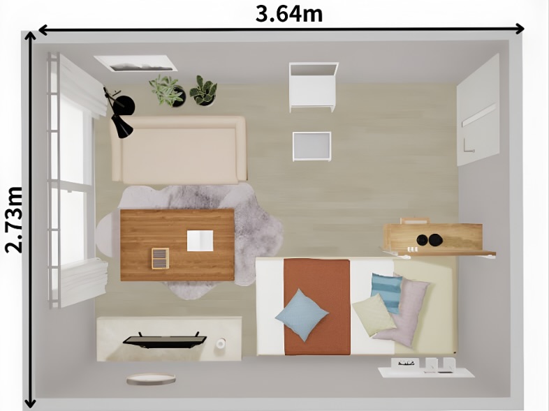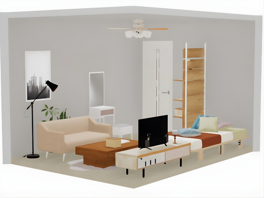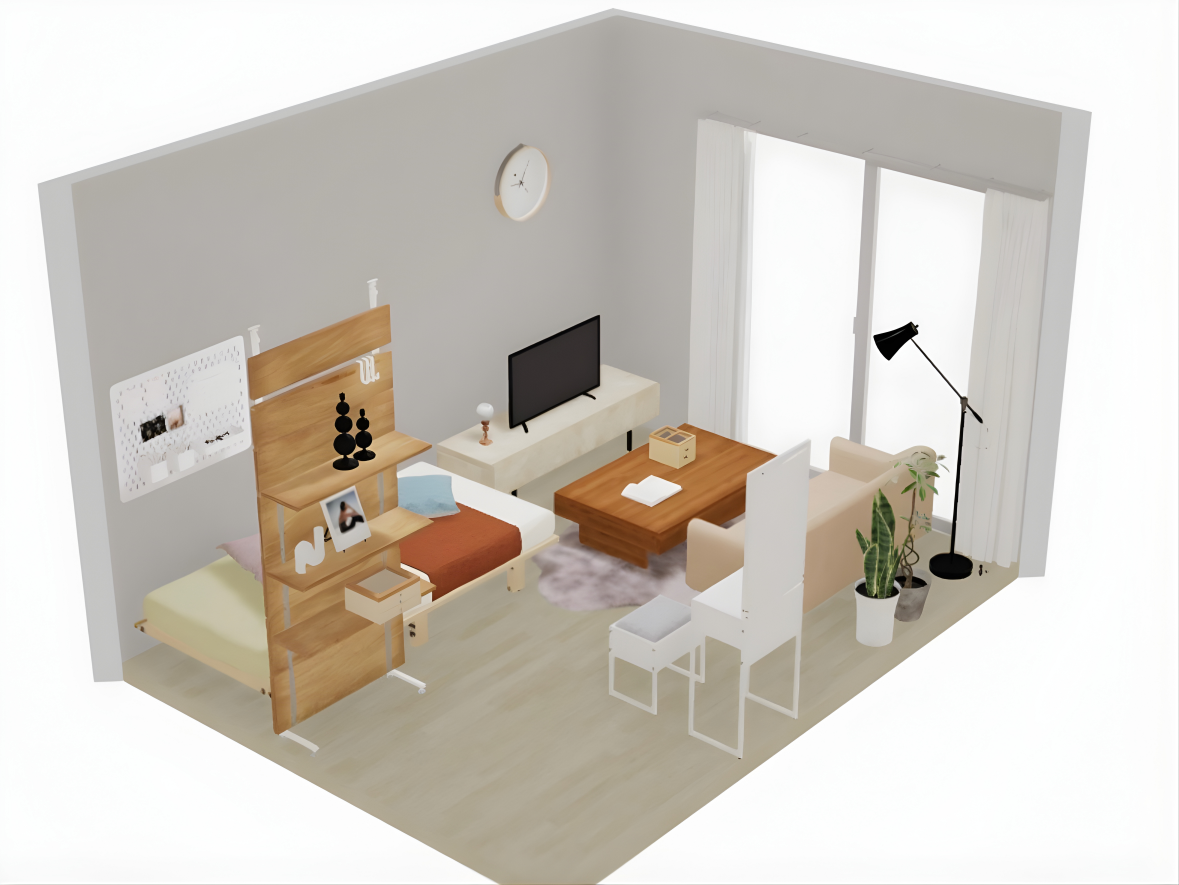 6畳(約10㎡)の1Kに、ナチュラルカラーを基調としたレイアウト例です。仕切りラックを活用してベッドとリビングスペースを分け、ソファとベッドを同居させつつ落ち着いた雰囲気を演出しています。