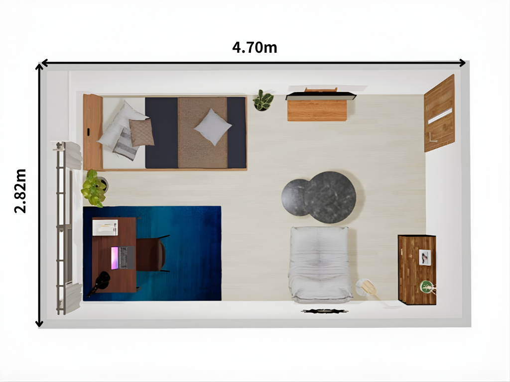 約4.7m×2.8m(約8畳)の1K空間を、パソコンデスクを主役にした「ワーク&リラックス両立型レイアウト」でまとめた一人暮らし向けのレイアウト例です。