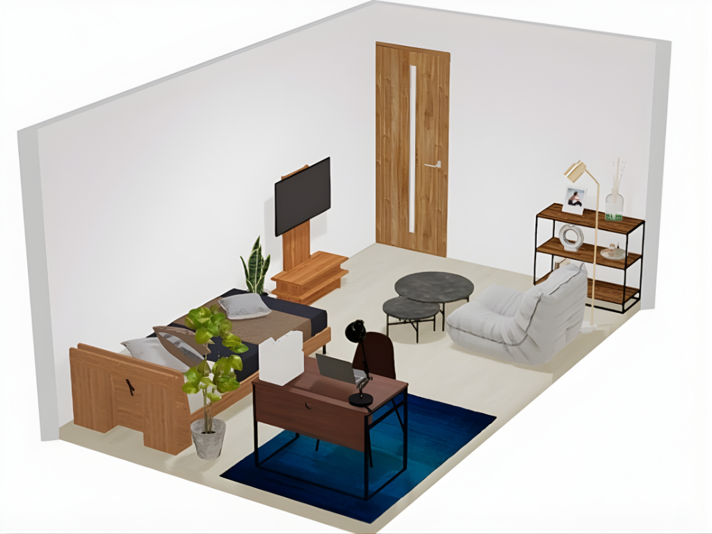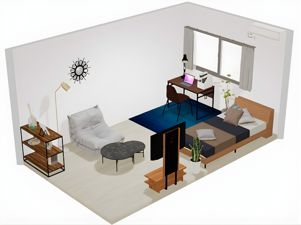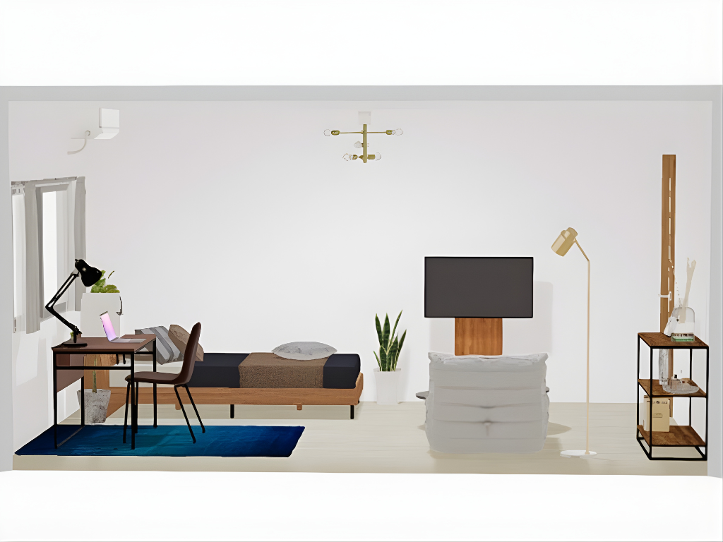 窓側から見ると、手前にワークスペースとベッド、奥にテレビを配置したメリハリのある構成。パソコンデスクとチェアは自然光が差し込む位置に置くことで、長時間の作業でも快適に過ごせます。