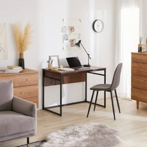 ウォルナット調のデスクとヴィンテージ感のあるチェアを窓際に配置し、自然光を取り込みながら集中できるワークスペースを確保。中央には大理石柄のネストテーブルとウレタンフロアソファを置き、仕事後にゆったりくつろげるリビングゾーンをつくっています。