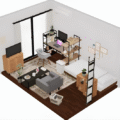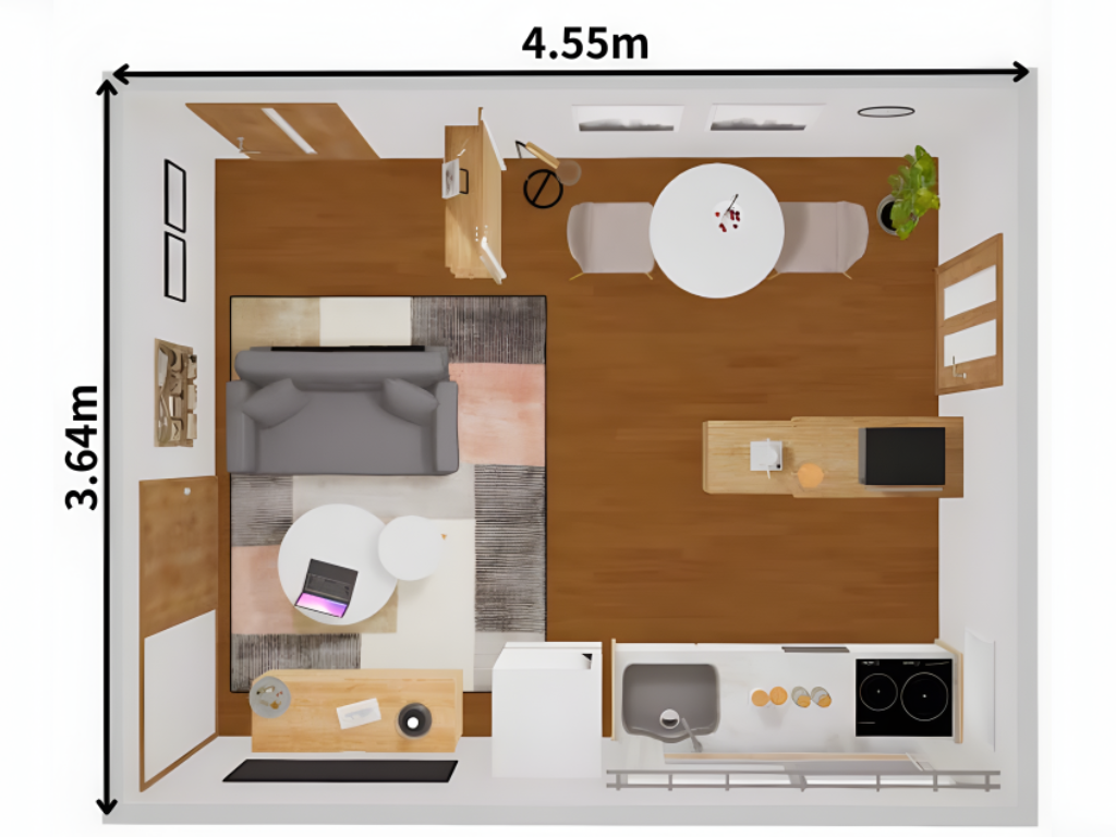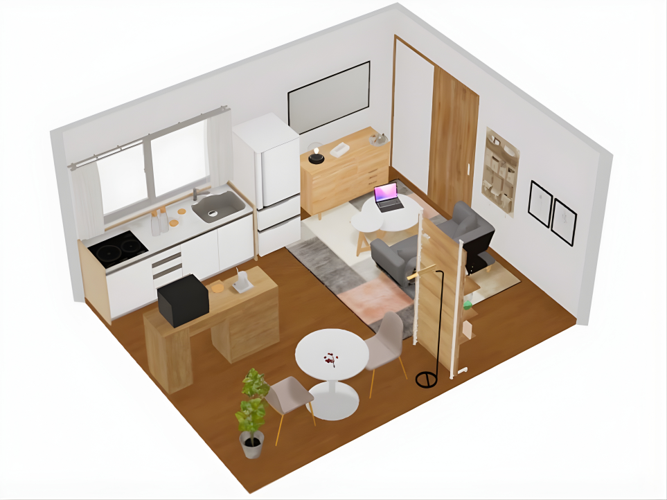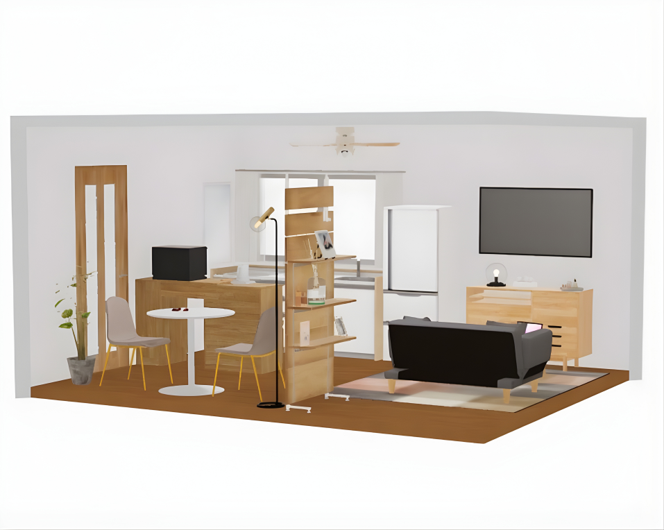 10畳(約16㎡)の1LDKに、ナチュラルウッドとグレーを基調としたリビングレイアウト例です。突っ張りラックを活用して空間をゆるやかに仕切り、リビング・ダイニング・キッチンがバランスよく調和したレイアウトに仕上げています。