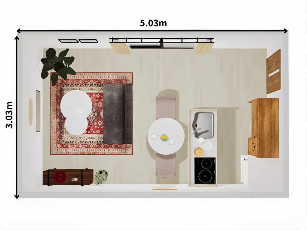 約5.03m × 3.03m(約9畳)の細長い1LDK空間を、ダイニングとリビングを兼ねた「ダイニングソファスタイル」でまとめたレイアウト例です。