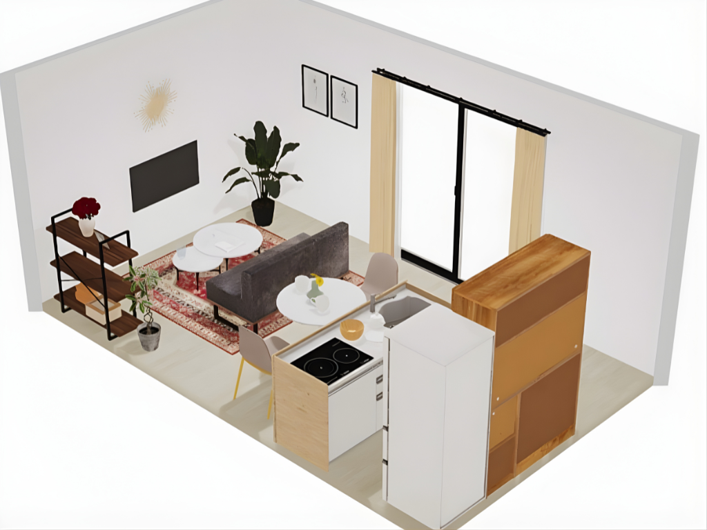 リビング側にはレッド系の大判ラグを敷き、くつろぎスペースを視覚的にゾーニング。キッチン側には食器棚と家電収納をまとめ、動線を妨げない使いやすい間取りにしています。