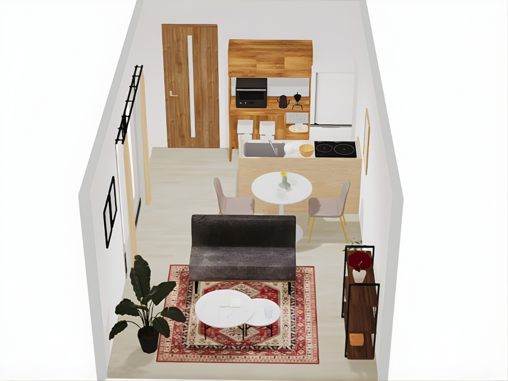 ソファ側から見ると、正面にキッチンとダイニングテーブル、背後にラグとネストテーブルが広がる構成。視界が抜けるレイアウトにより、限られた面積でも圧迫感を感じさせません。
