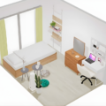 別アングルから見ると、ベッド・ドレッサー・収納棚の配置を工夫し、生活動線を確保しながら家具を配置していることがわかります。