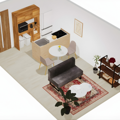 約4.7m×2.8m(約8畳)の1K空間を、パソコンデスクを主役にした「ワーク&リラックス両立型レイアウト」でまとめた一人暮らし向けのレイアウト例です。ウォルナット調のデスクとヴィンテージ感のあるチェ...