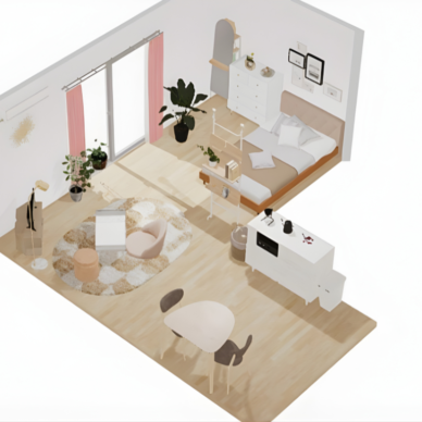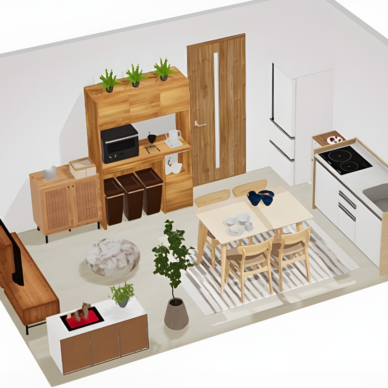 7畳の寝室にダブルベッドを配置し、ブラックの収納家具や正方形のドレッサーを組み合わせたホテルライクなレイアウト例を紹介。大きめのラグや間接照明、観葉植物を取り入れ、圧迫感を抑えつつ落ち着いてくつろげる空間づくりのポイントを解説します。