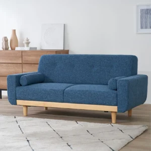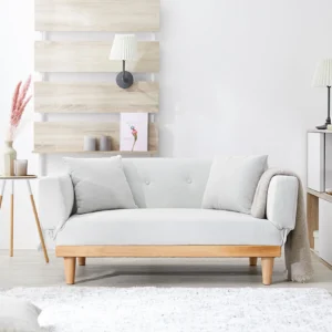 木製脚のぬくもりが魅力の2人掛けソファ。幅156cmとコンパクトな2.5人掛けサイズながら、座面幅は約130cmとゆとりがあり、二人で座っても余裕があります。脚を外せばローソファとして使用できるので、10畳ほどの1LDKでも圧迫感を抑えられます。