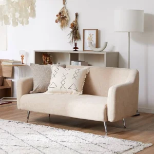 もっちりとした厚みのあるクッションはソフト・ファブリック・ブークレの3種類から選べ、特にループ状のブークレ生地はSNSでも人気です。圧縮梱包で届き、段ボール1箱で搬入できるので、エレベーターのない集合住宅でも扱いやすいのも魅力です。